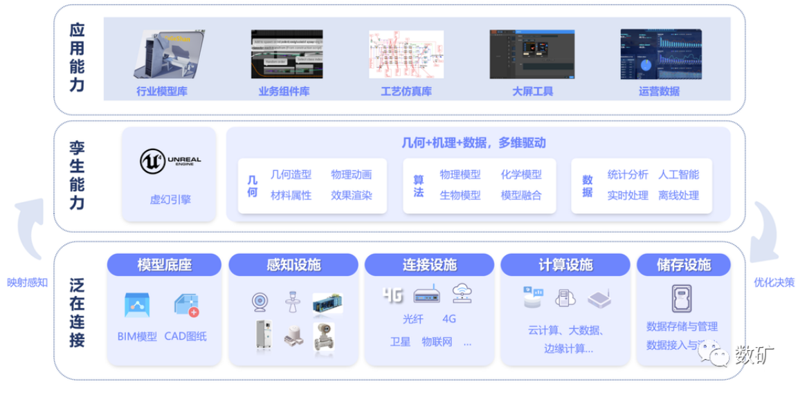 孿生能力:基于對物理實體的數字化表達,以歷史數據、實時數據為基礎,融合幾何、機理、AI等多種數學模型,結合VR、AR技術實現對物理對象的映射呈現、分析優化、診斷預測以及閉環控制。